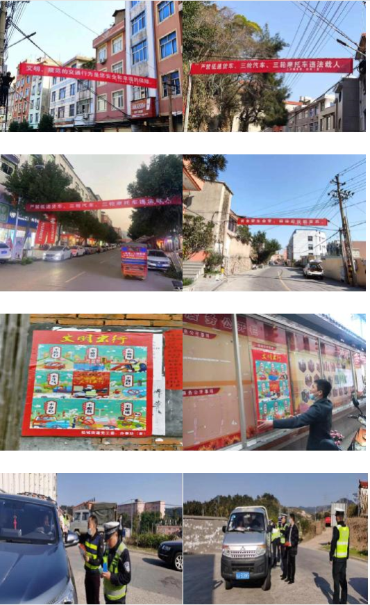 松城、三沙、牙城、下浒、北壁等乡镇(街道)道安办组织工作人员在交通卡口、重点路段设立宣传教育标语横幅、海报,并提醒来往交通参与者注意交通安全。