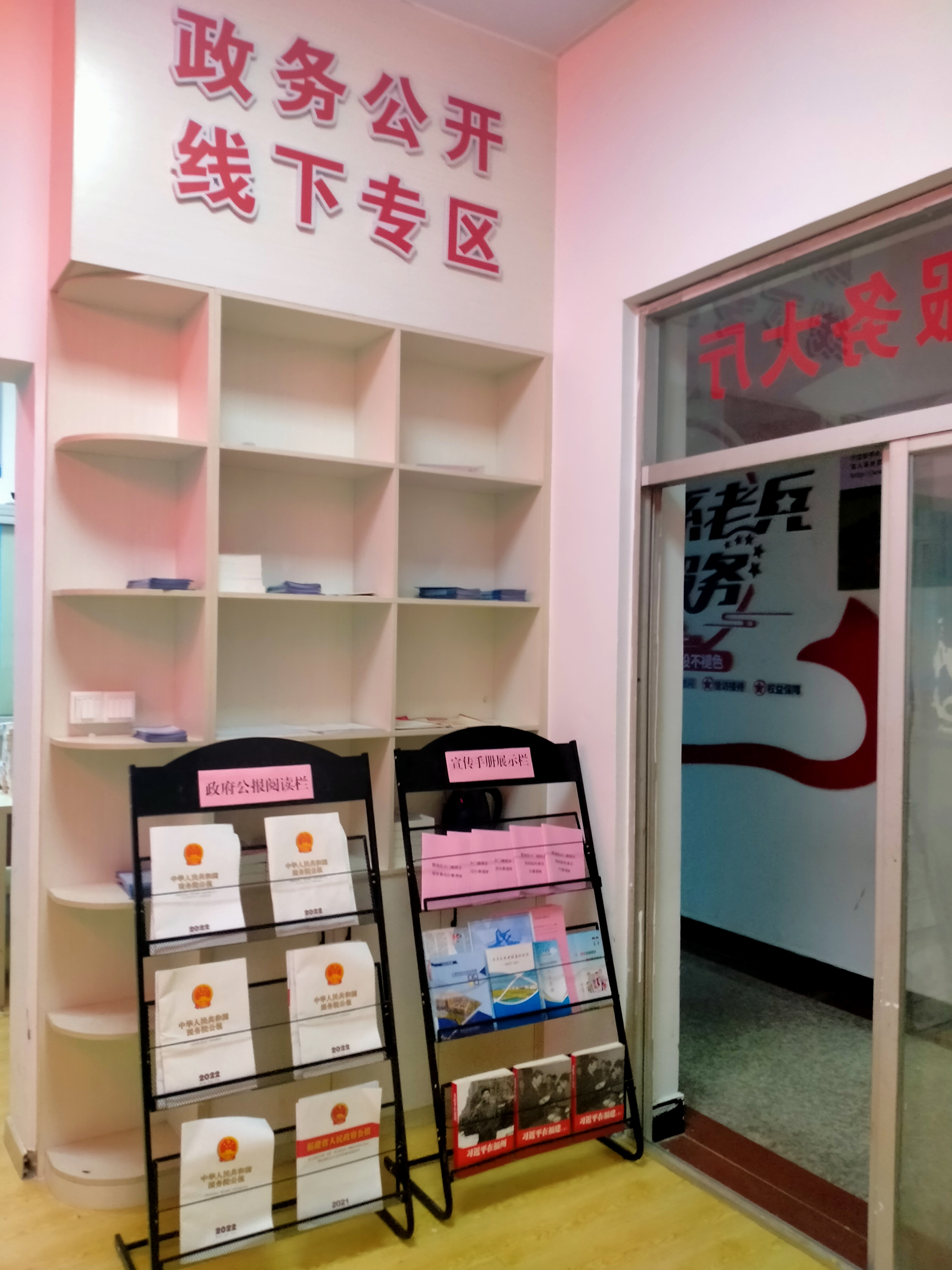 3、便民设施配置区。为更好的服务群众,创造良好的政务公开体验环境,及时为群众提供休息座椅、应急医药箱、报刊阅读等。